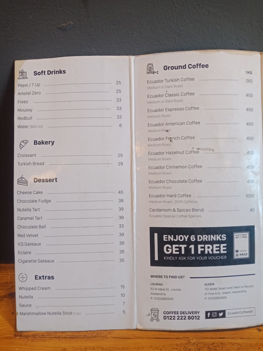 Welcome to Ecuador Coffee (Louran), nestled in the heart of Alexandria at 52 Al Mesak, As Soyouf Bahri. Renowned for its exceptional coffee, this charming café is a haven for aficionados seeking quality in every cup. The menu showcases a diverse selection of coffee blends, each meticulously crafted, ensuring every sip reflects the rich origins of the beans.